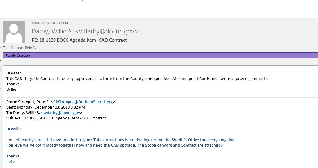 County Manager’s Recommendation: The County Manager recommends that the Board approve Budget Ordinance Amendment No.19BCC000021 appropriating $263,438 of General Fund Fund Balance and execute the attached contract with TriTech Software Systems for services related to the upgrade of computer aided dispatch (CAD) and Mobile systems for the Sheriff’s Office.